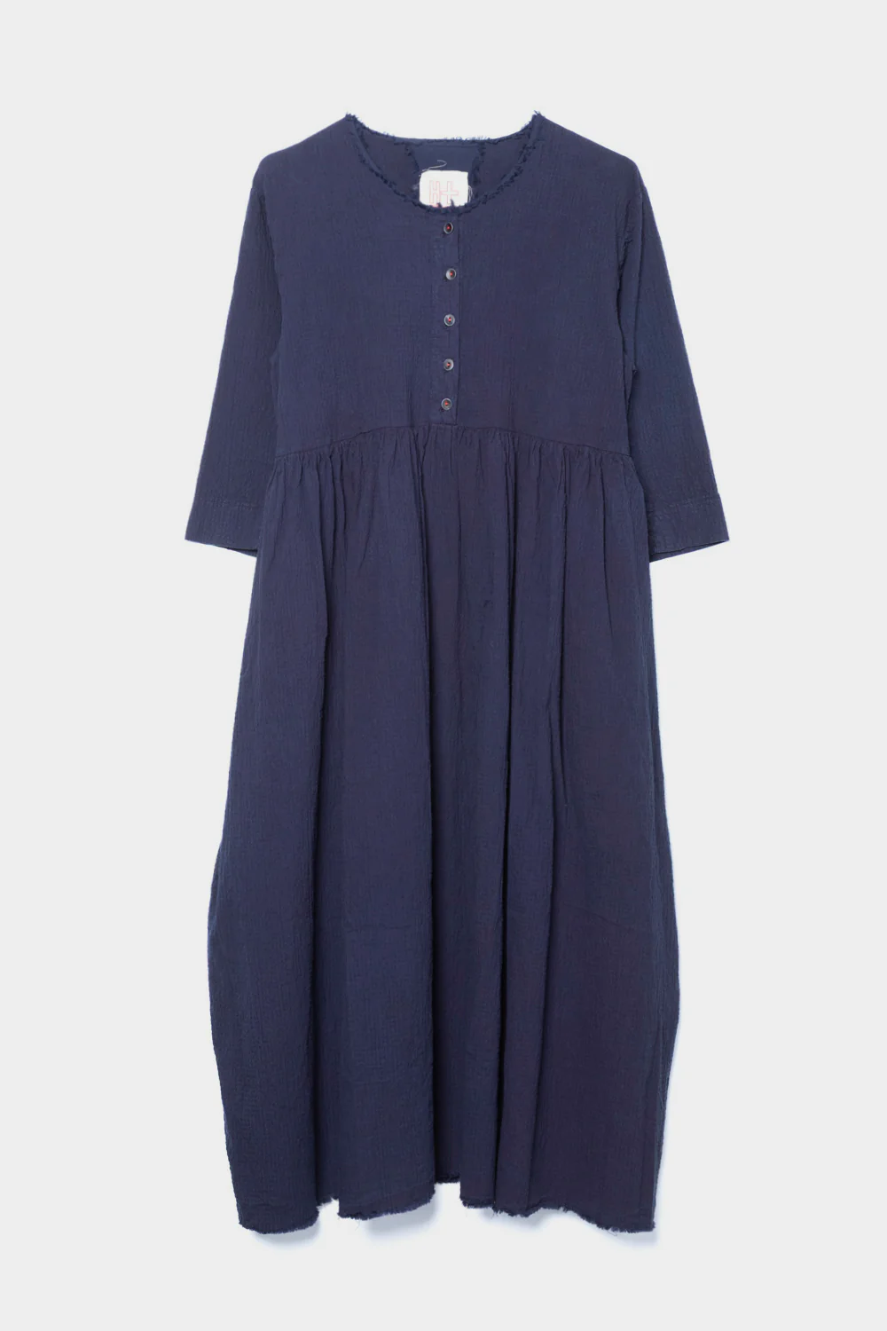 Abito lungo in cotone blu Manica a ¾ Scollo tondo con bottoni Gonna ampia e cucitura in vita Designer HANNON WESSEL Modello s25143 Spedizione gratuita in Italia.