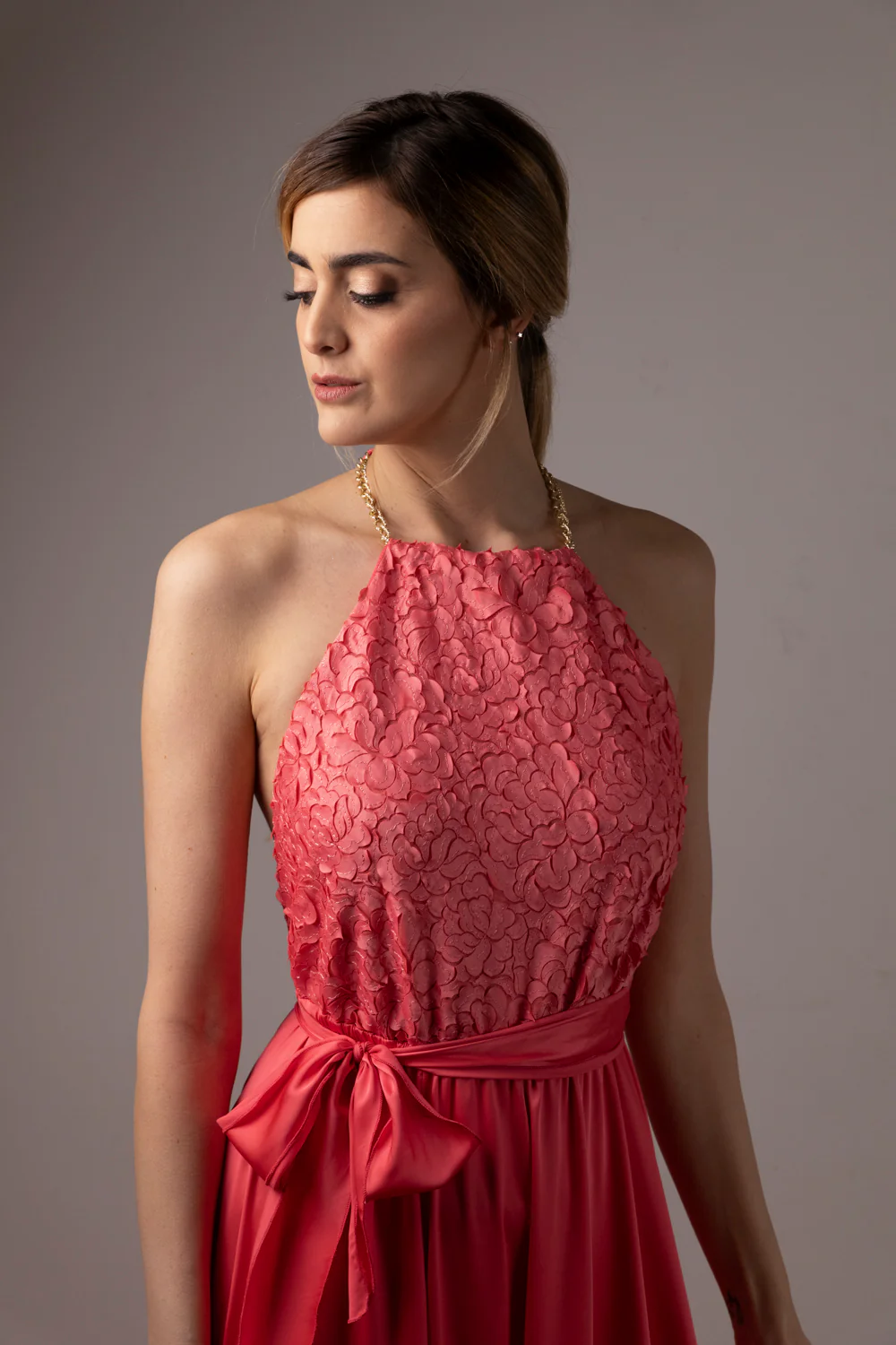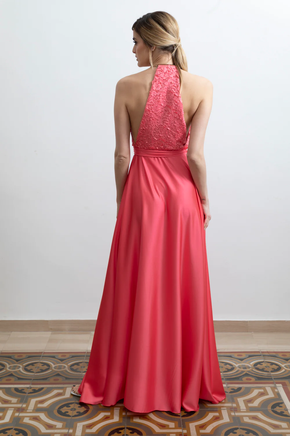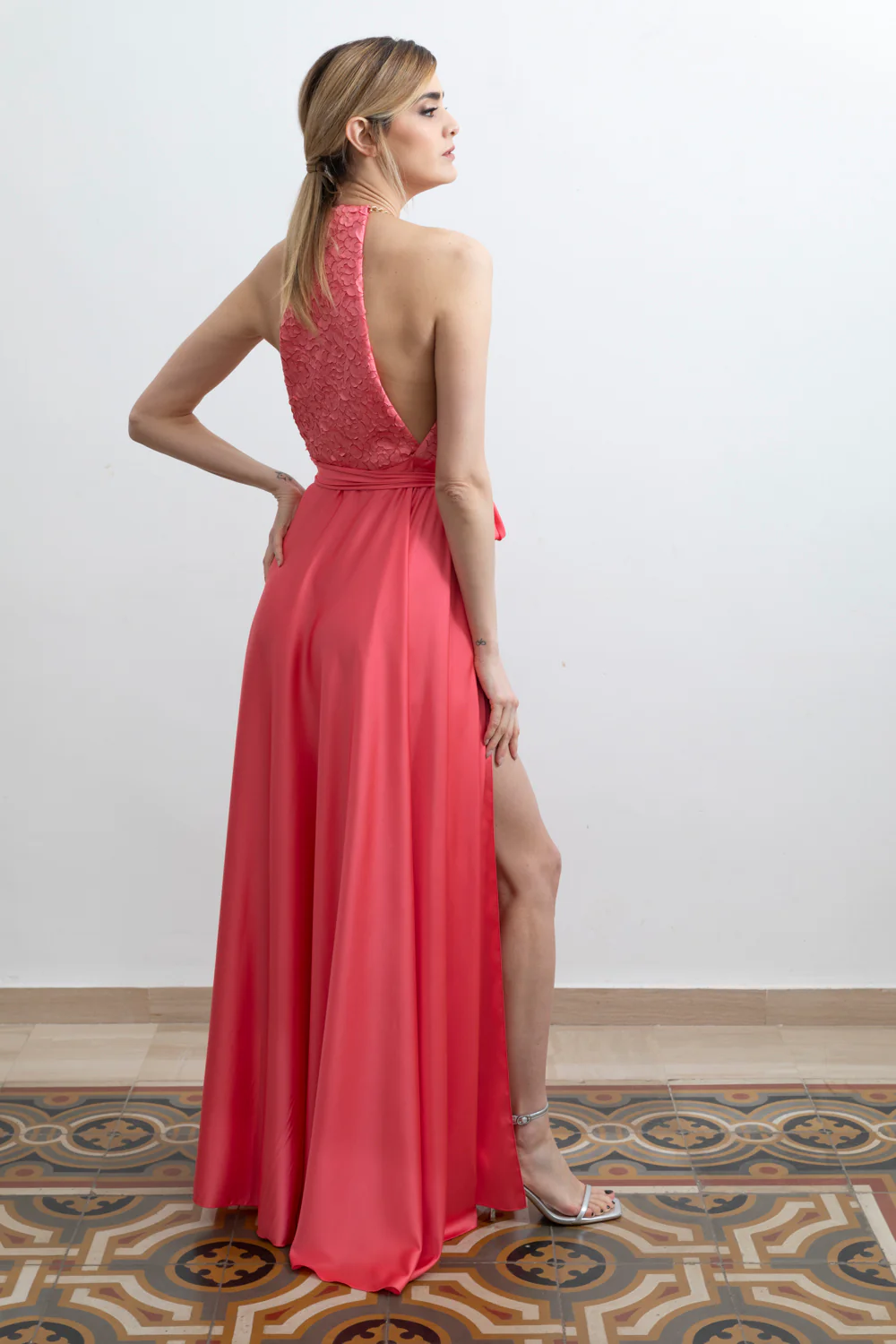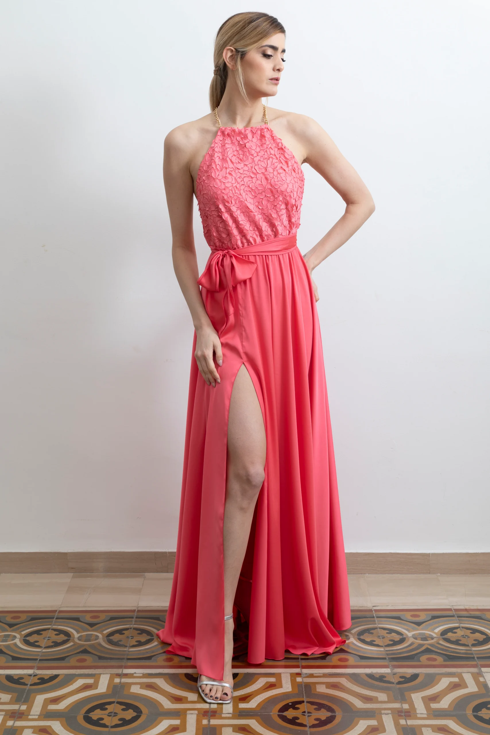 Abito Red Carpet lungo in satin corallo e pizzo 3D con scollo americano e spacco