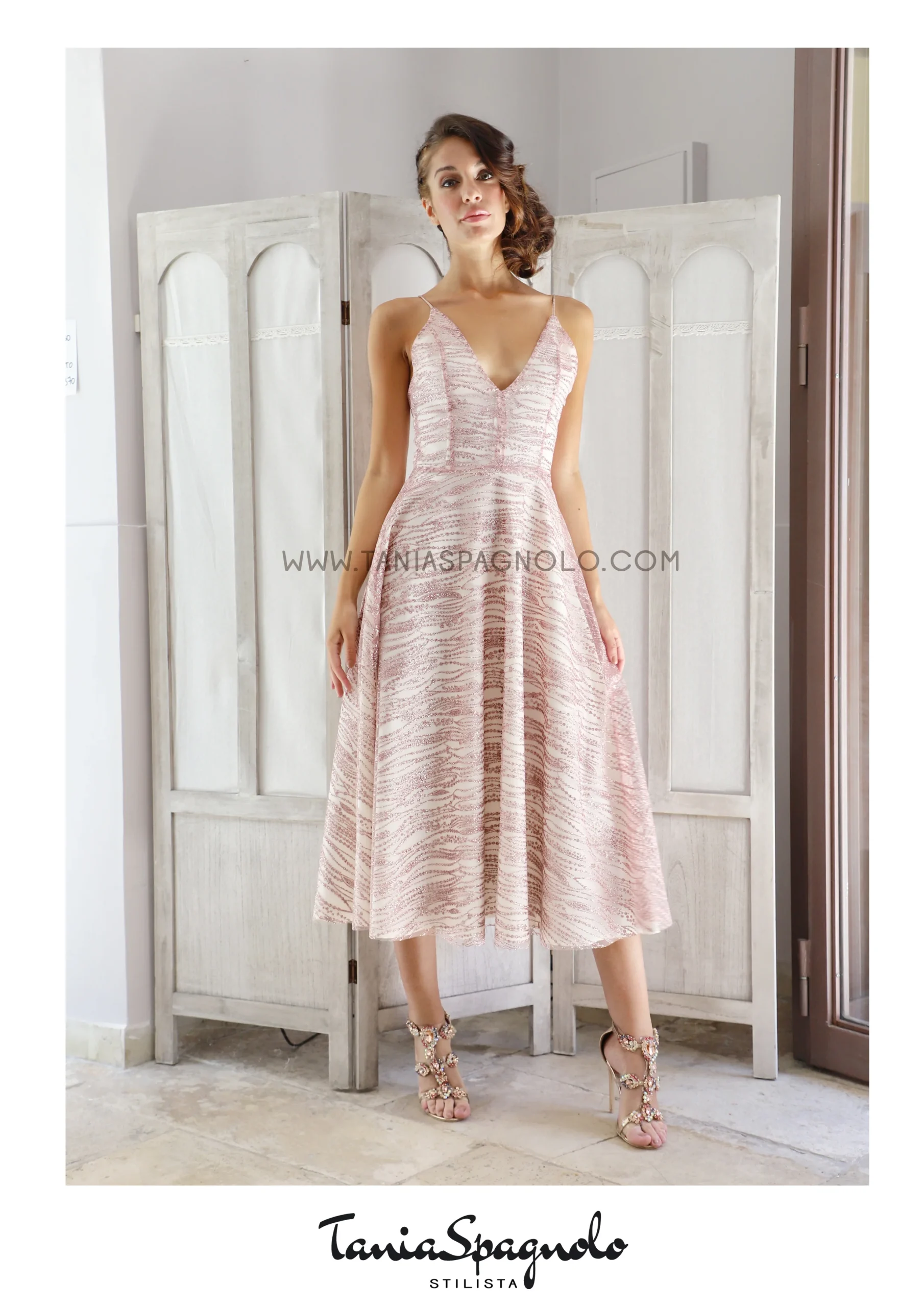 Eleganza e sensualitร per questo abito midi dal gusto anni 50. Tania Spagnolo sceglie un prezioso pizzo glitterato rosa a rilievo, in contrapposizione al tessuto panna sottostante.