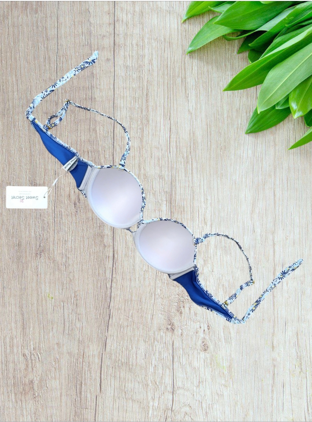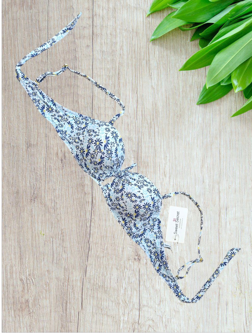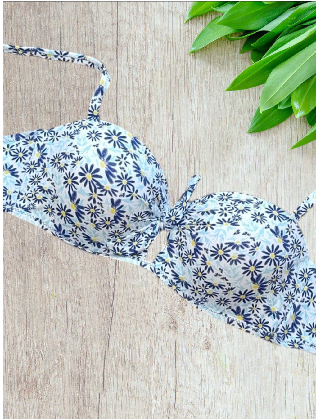 Bikini a balconcino modello fascia con stampe di margherite blu e slip a brasiliano taglia 46/XL