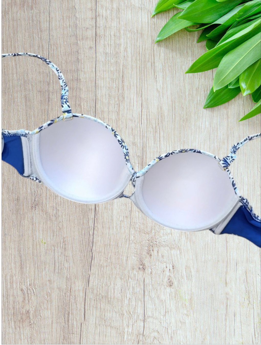 -il costume è in base di colore blu royal con il reggiseno arricchito delle stampe di bellissime margherite blumentre lo slip è a tinta unita;