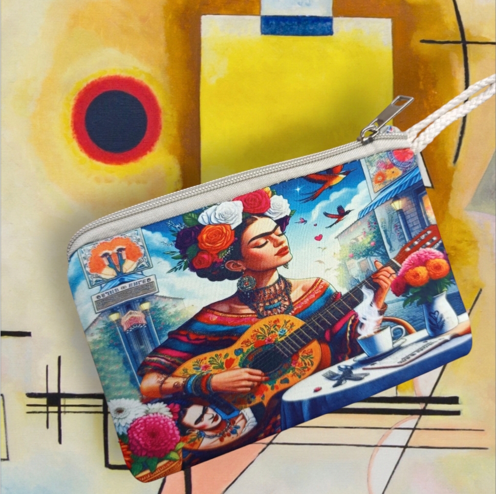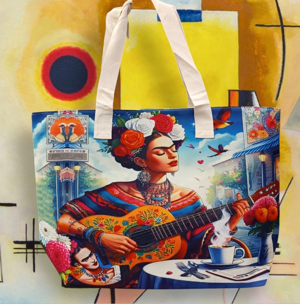 Grande borsa mare rappresentante l’opera “Frida Kalo” autoritratto con chitarra.