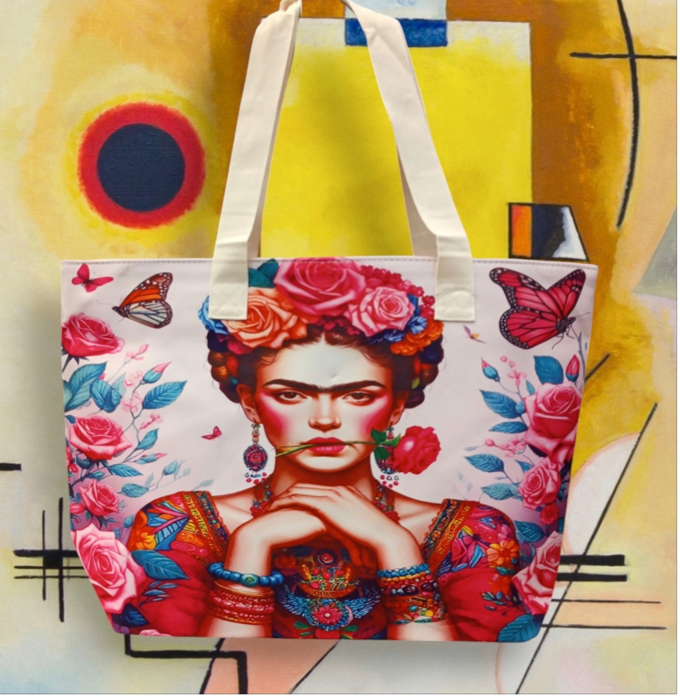 Grande borsa mare rappresentante l’opera “Frida Kalo” autoritratto con rose.