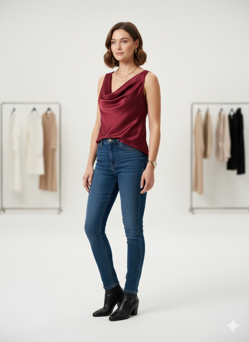 Canotta in Raso con Scollo ad anello – 100% Made in Italy Eleva il tuo stile con la nostra canotta in raso fluido, un mix perfetto di comfort e raffinatezza
