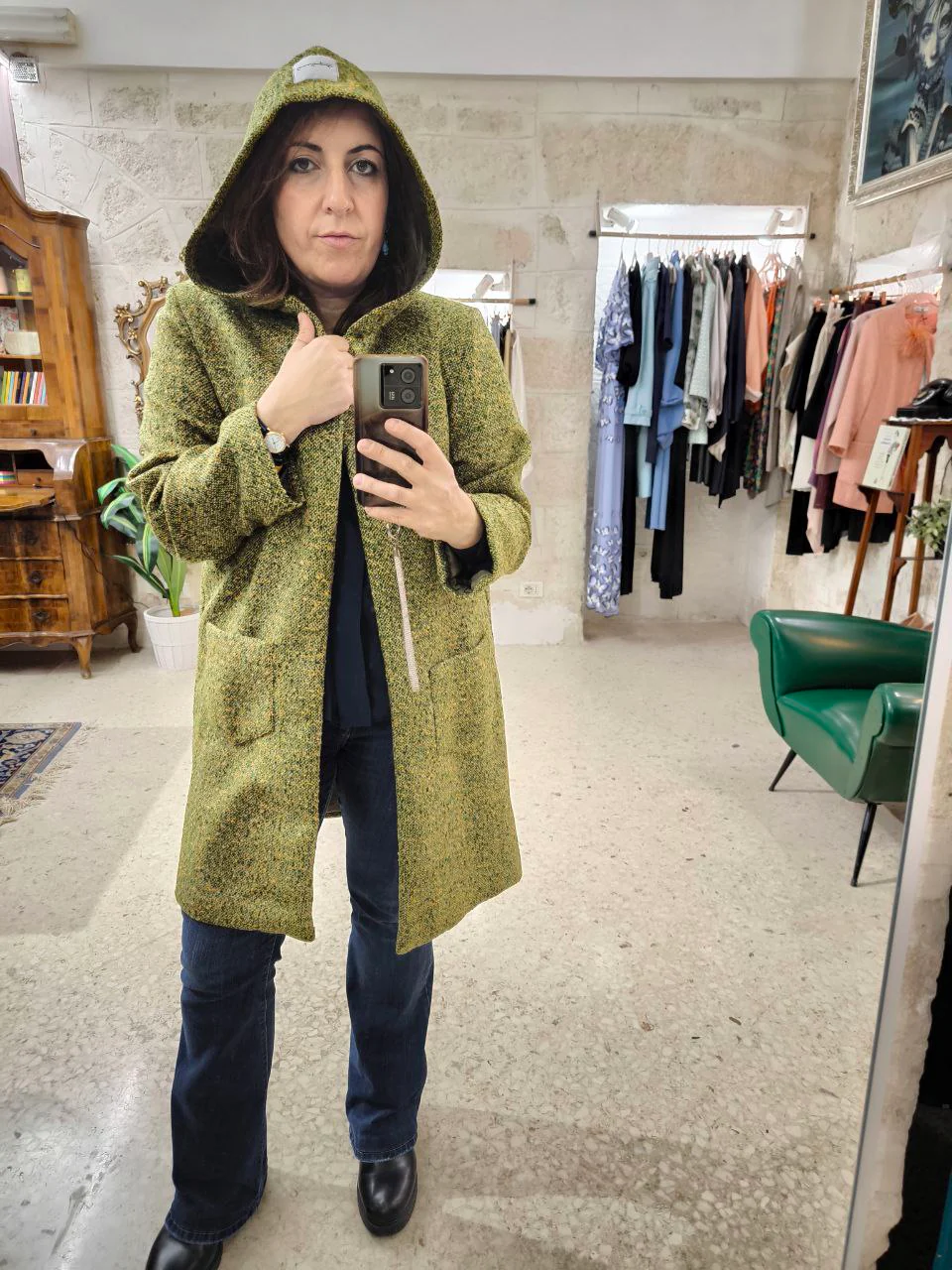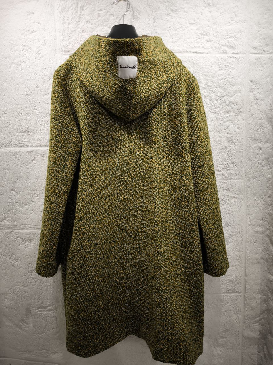 Cappotto corto sartoriale con cappuccio in tweed di lana verde