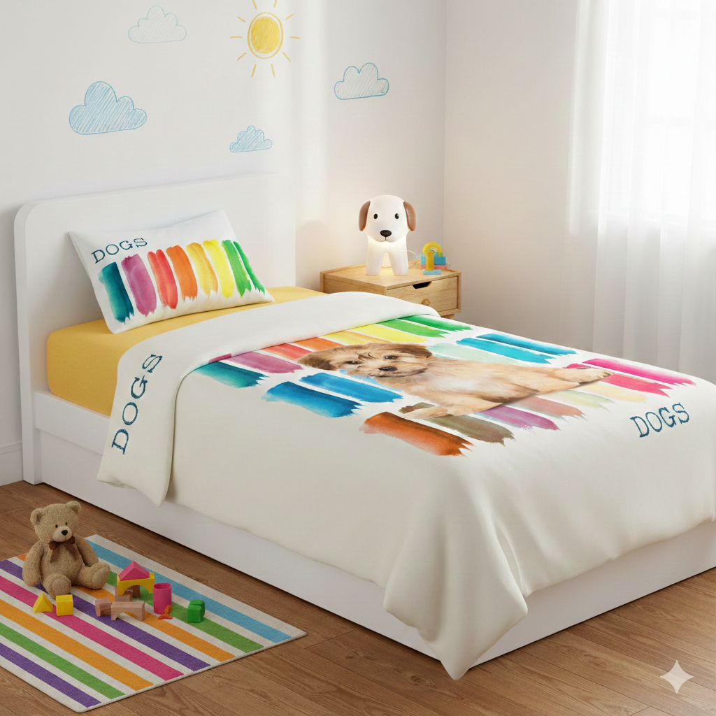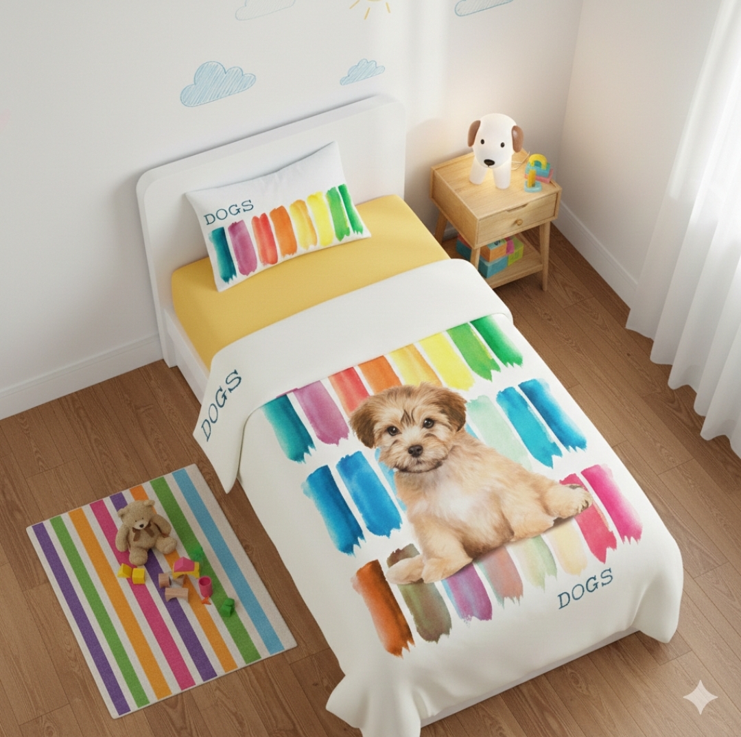 Stampa Digitale Piazzata: Il lenzuolo di sopra presenta un tenero cucciolo su uno sfondo di pennellate multicolor effetto acquerello.