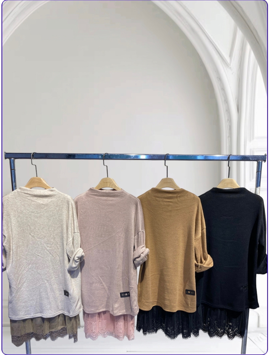 La sottana/abitino è a spalla larga con inserti in pizzo che fuoriescono dal maxipull.