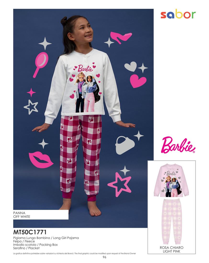 Rendi magiche le notti della tua piccola con questo adorabile pigiama lungo firmato Barbie! Realizzato in caldo cotone morbido e traspirante, è perfetto per le stagioni più fresche. Il set include una maglia a maniche lunghe color panna con stampa vivace delle iconiche Barbie, cuori, stelle e simboli di bellezza, abbinata a pantaloni rosa chiaro a quadretti per un look dolce e giocoso.