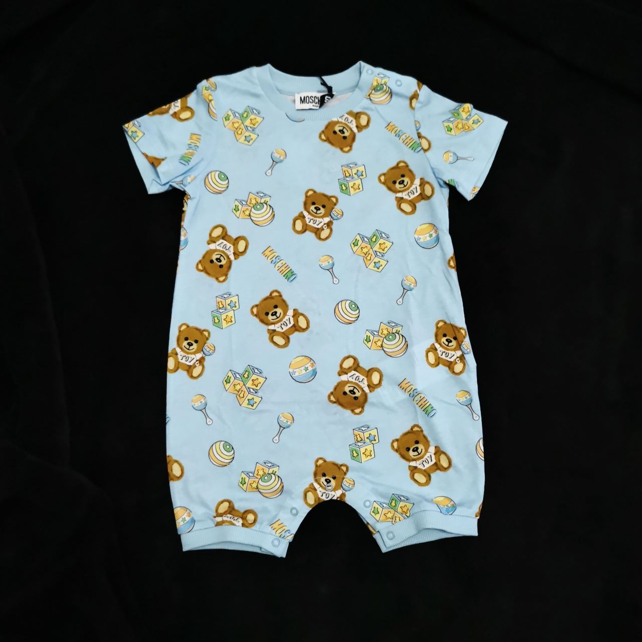 Moschino Pagliaccetto Neonato girocollo, celeste con stampe toy