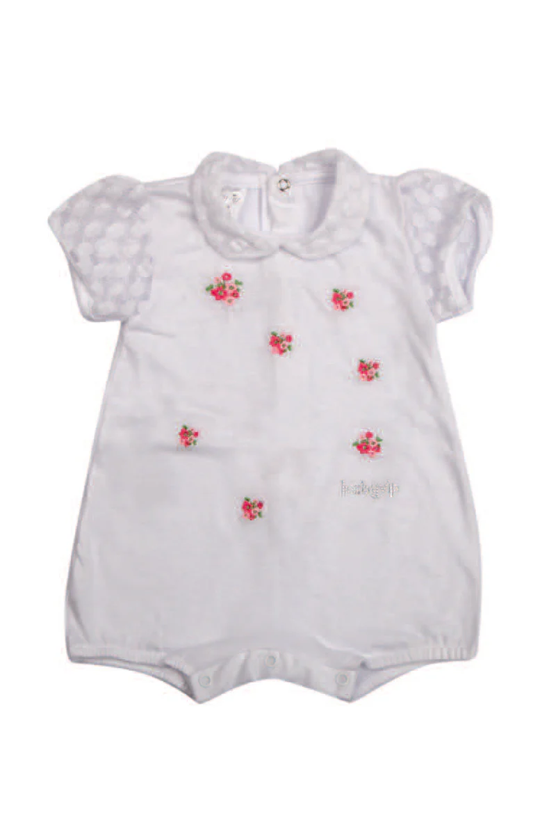 - Impreziosito da un ricamo floreale su fondo bianco con inserti in pizzo e scritta BabyVip in strass.