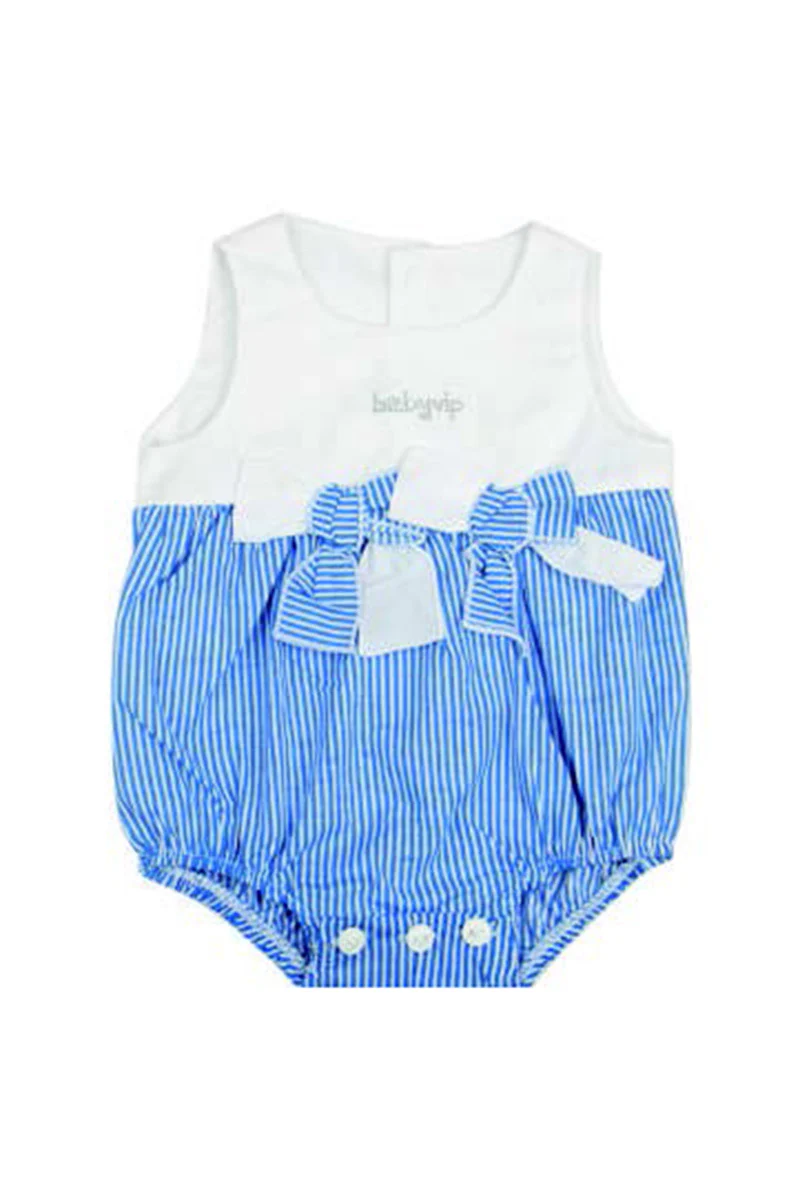 Pagliaccetto spalla larga in cotone con fiocco e strass fantasia rigata
