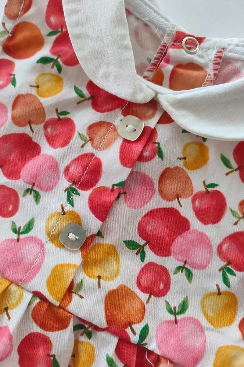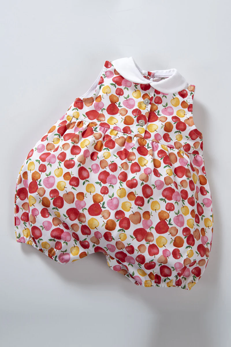 Pagliaccetto spalla larga in tela di cotone fantasia mele con colletto in piquet a navetta, finta apertura sul davanti e taglio con arricciatura