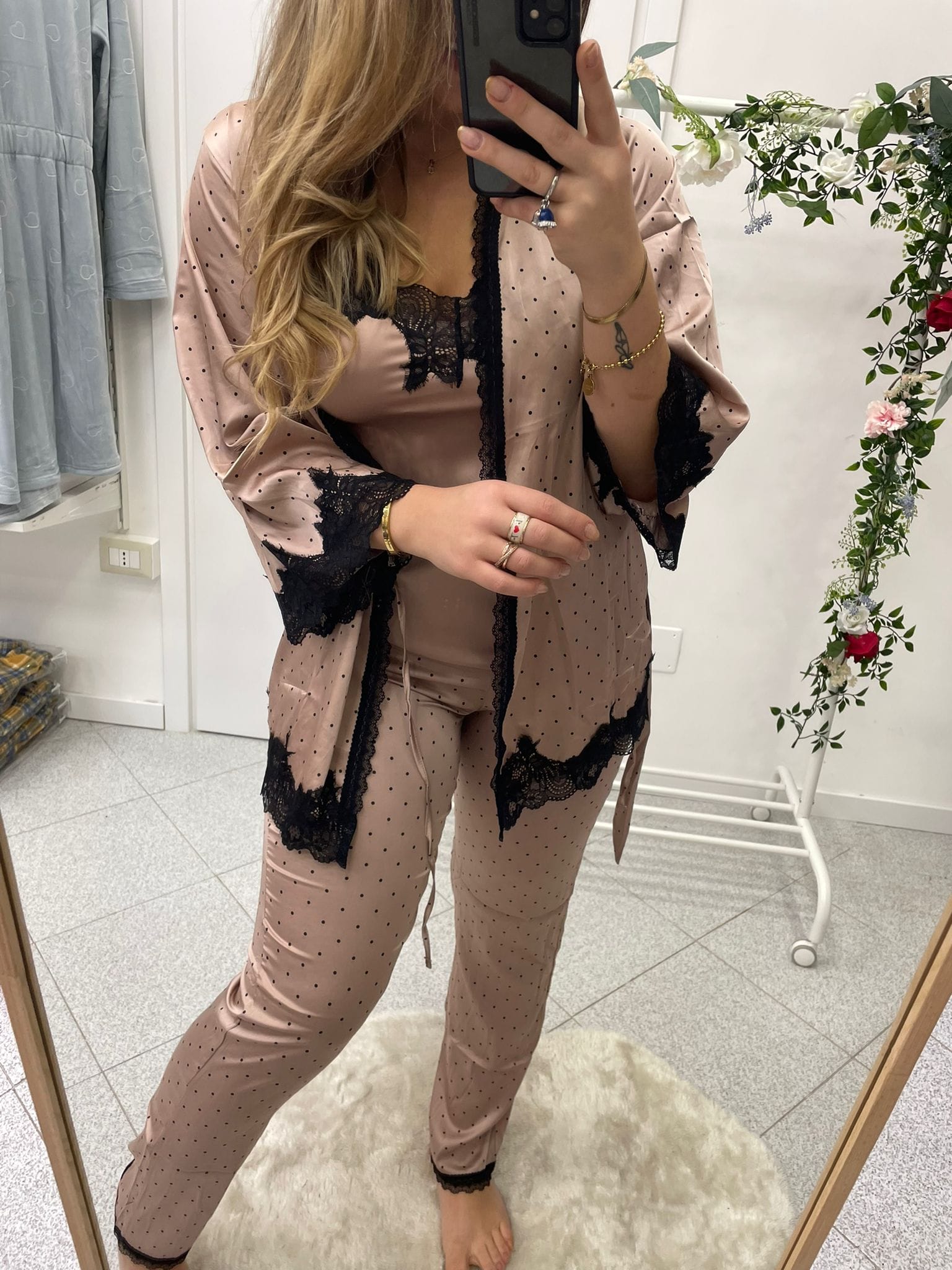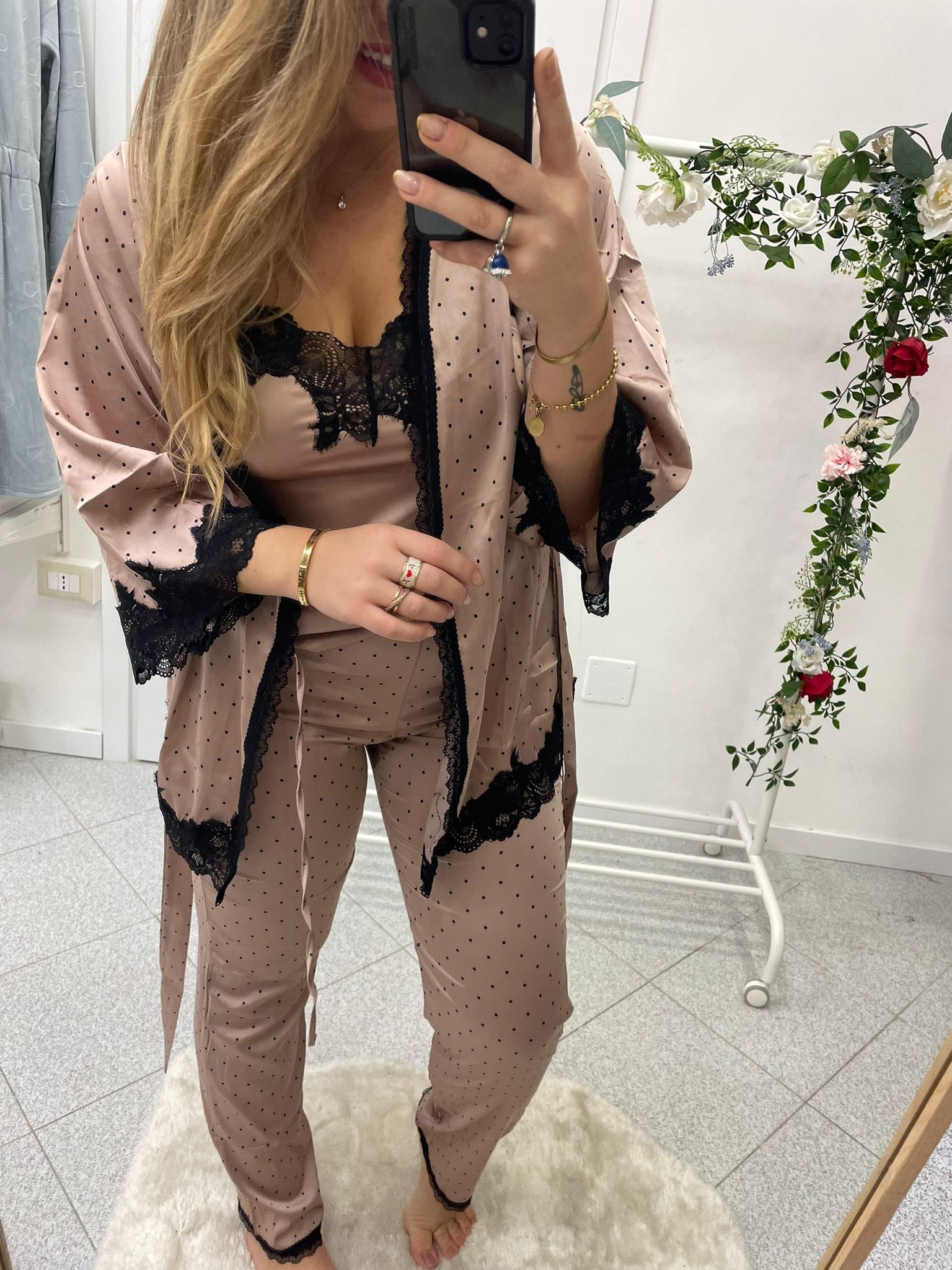 Pigiama donna in raso tre pezzi fantasia a pois