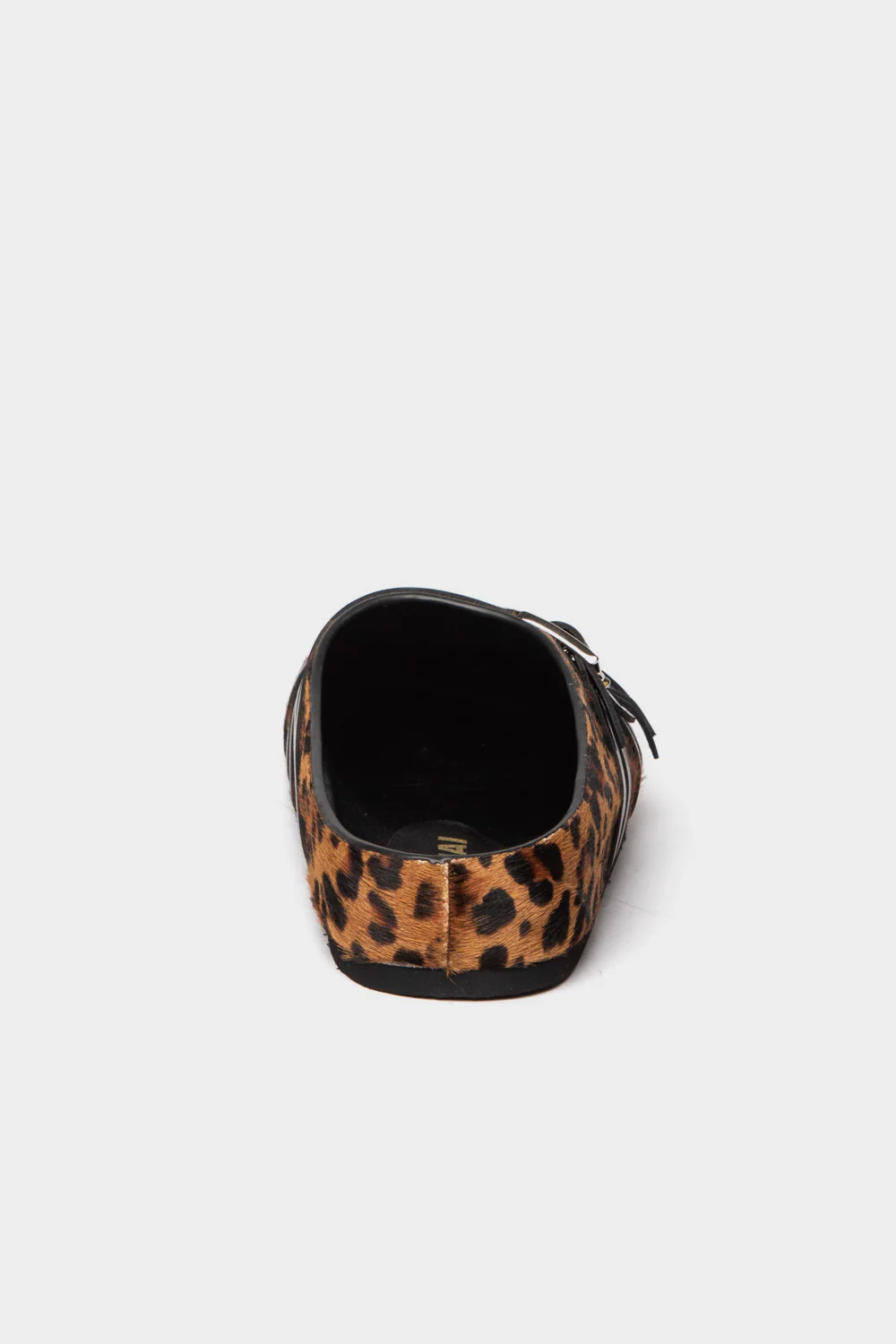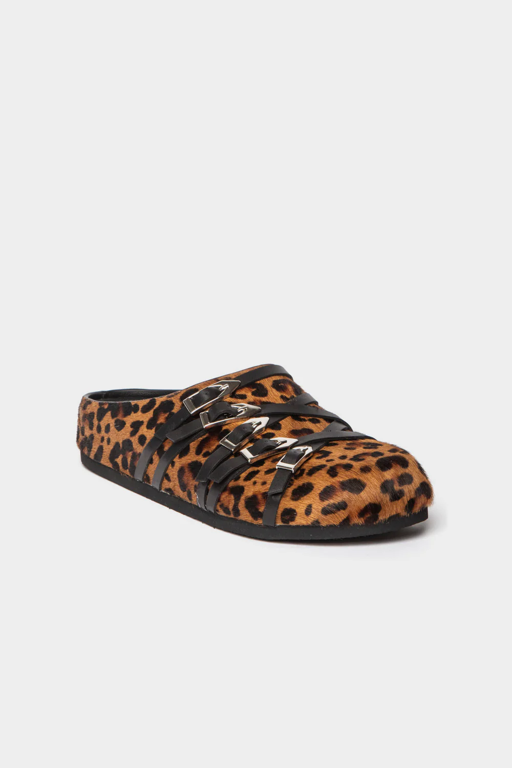 Leo sabot in cavallino maculato cinturini incrociati in pelle nera con fibbie sulla tomaia plantare interno Designer MI/MAI Modello toledo_leo Spedizione gratuita in Italia.